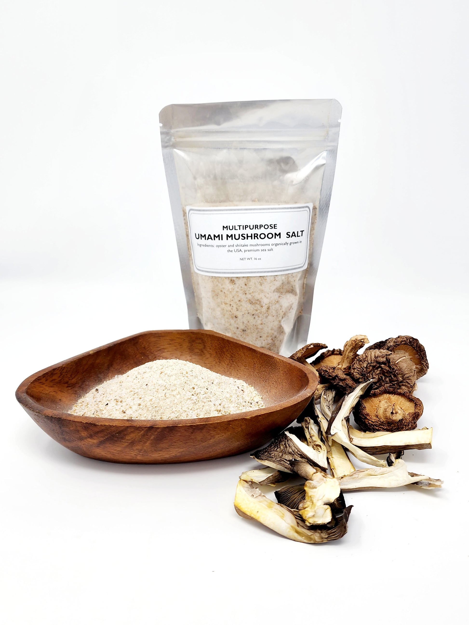 We mix grinded Shiitake and Oyster mushrooms with Mediterranean fine sea salt and then baked it, giving the salt the smell and taste of baked mushrooms. Mushroom salts give your dishes a deeper flavor making you add less salt to your food.